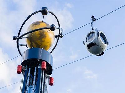 Она построена рядом с парком аттракционов Орион. Принцип работы этого фуникулера очень интересный: кабинки подзаряжаются, когда проезжают через «кольца зарядки». С высоких станций Воздушного трамвая открываются прекрасные виды на выставку. В выходные дни иногда перед посадкой приходится постоять в очереди.