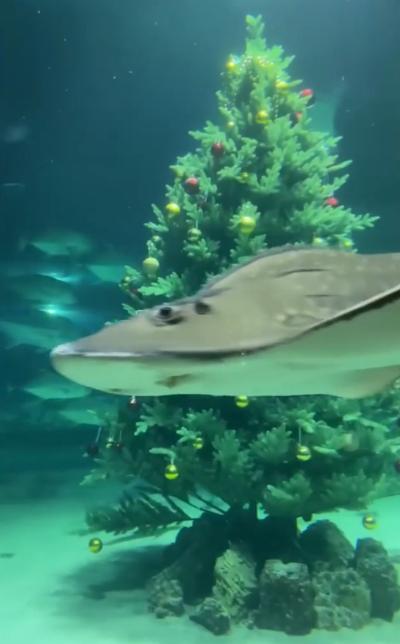 В Москвариум в одном из больших аквариумов под водой на глубине 4 с лишним метров установили праздничную елку. Большие скаты и другие рыбы подплывают к ней и интересуются, что это за необычное растение. А посетители в свою очередь с интересом наблюдают за рыбами. После рождественских праздников елку уберут.