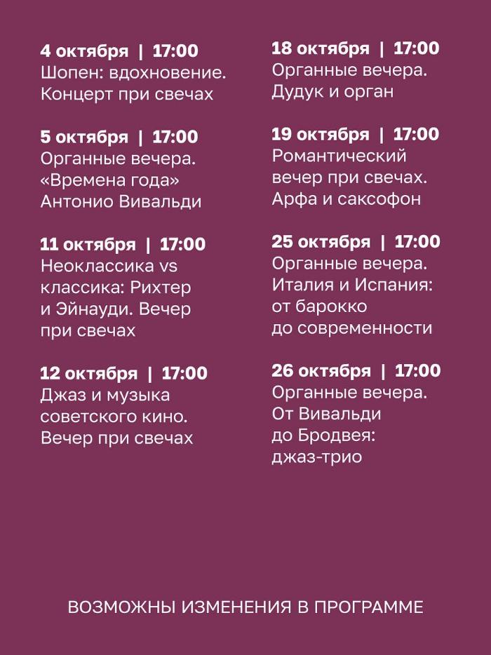 Будет звучать музыка разных стилей будет звучать в исполнении скрипки, саксофона, арфы, дудука, фортепиано и других инструментов. Классика и неоклассика, джаз, саундтреки к известным фильмам, хиты мировых звезд в исполнении артистов Филармонии, солистов Большого театра, Центра оперного пения Галины Вишневской и Музыкального театра им. К.С. Станиславского и Вл.И. Немировича-Данченко.