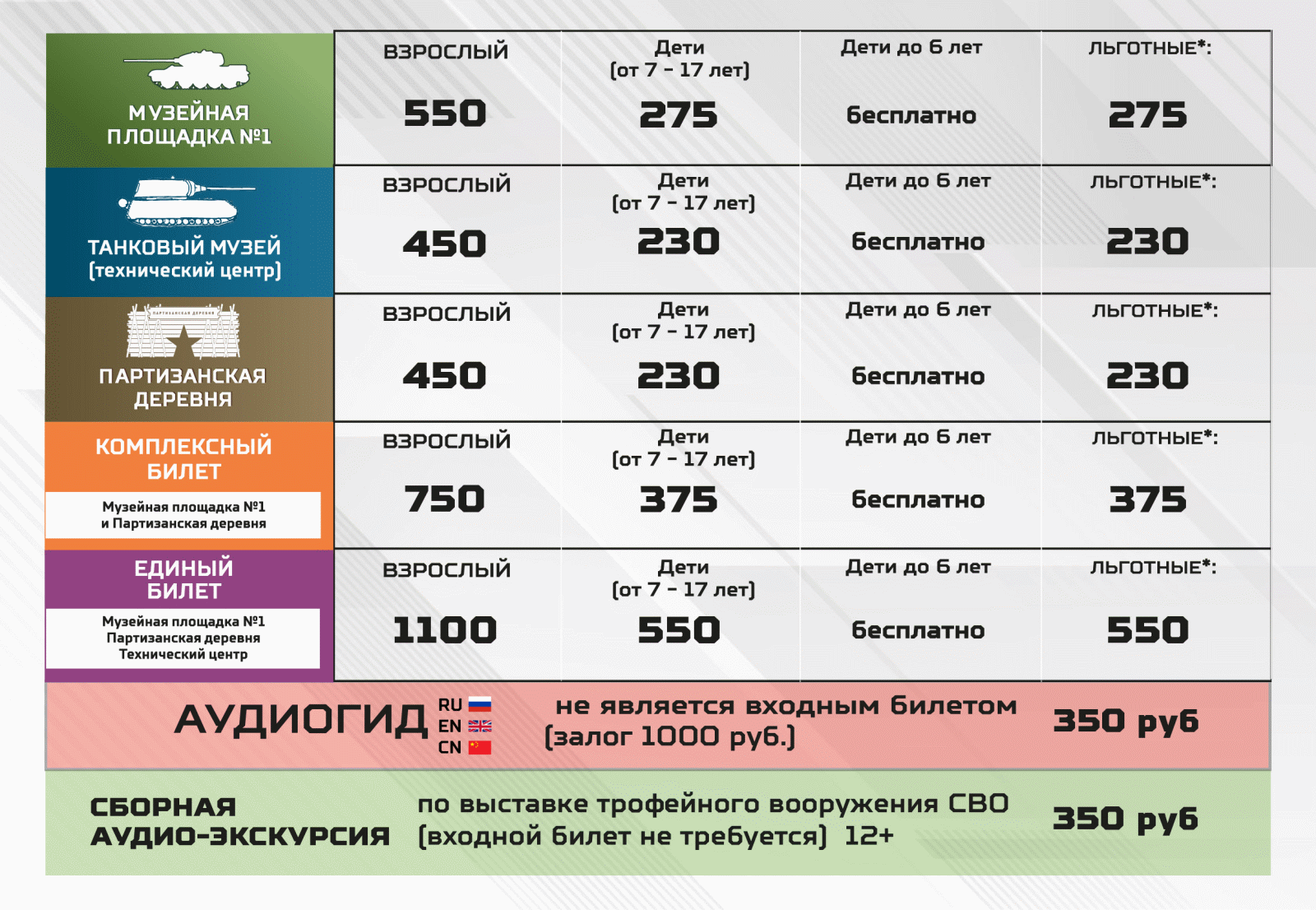 Также имеется "Тир с охолощенным современным и историческим оружием": для стрельбы без дополнительного оборудования, специальной подготовки, с максимальным реализмом; возрастные ограничения - старше 6 лет.
